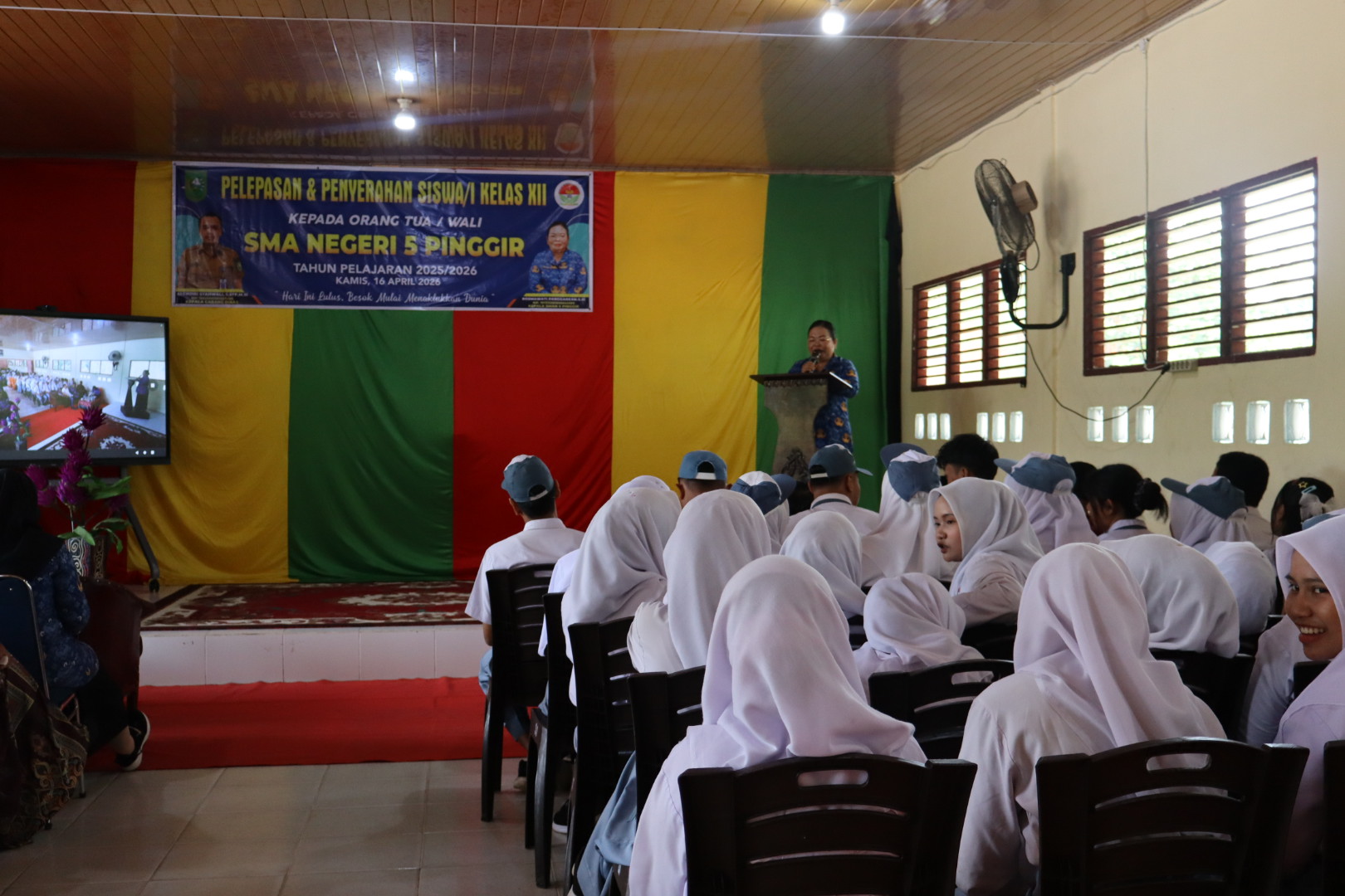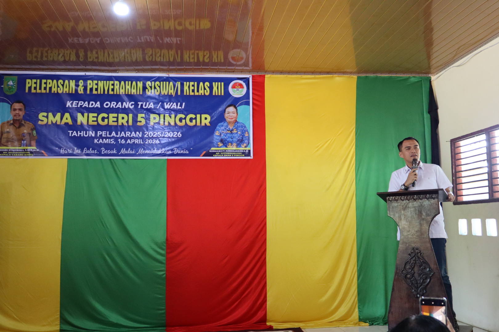 Pelepasan dan Penyerahan Siswa/i Kelas XII kepada orang tua/wali SMAN 5 Pinggir tahun pelajaran 2025/2026 kamis 16 April 2026 dengan tema "Hari ini lulus, besok mulai menaklukkan dunia"
